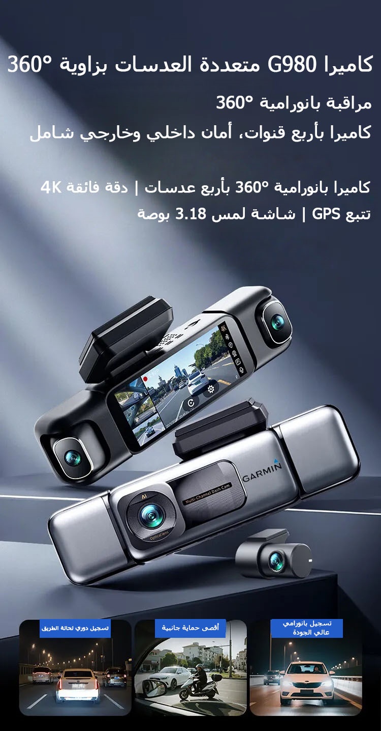 كاميرا Garmin G980 للسيارة تعمل بالذكاء الاصطناعي والتحكم الصوتي، مزودة بأربع كاميرات، ورؤية بانورامية 360 درجة، ورؤية ليلية فائقة الوضوح بدقة 4K، ونظام تحديد المواقع العالمي (GPS).