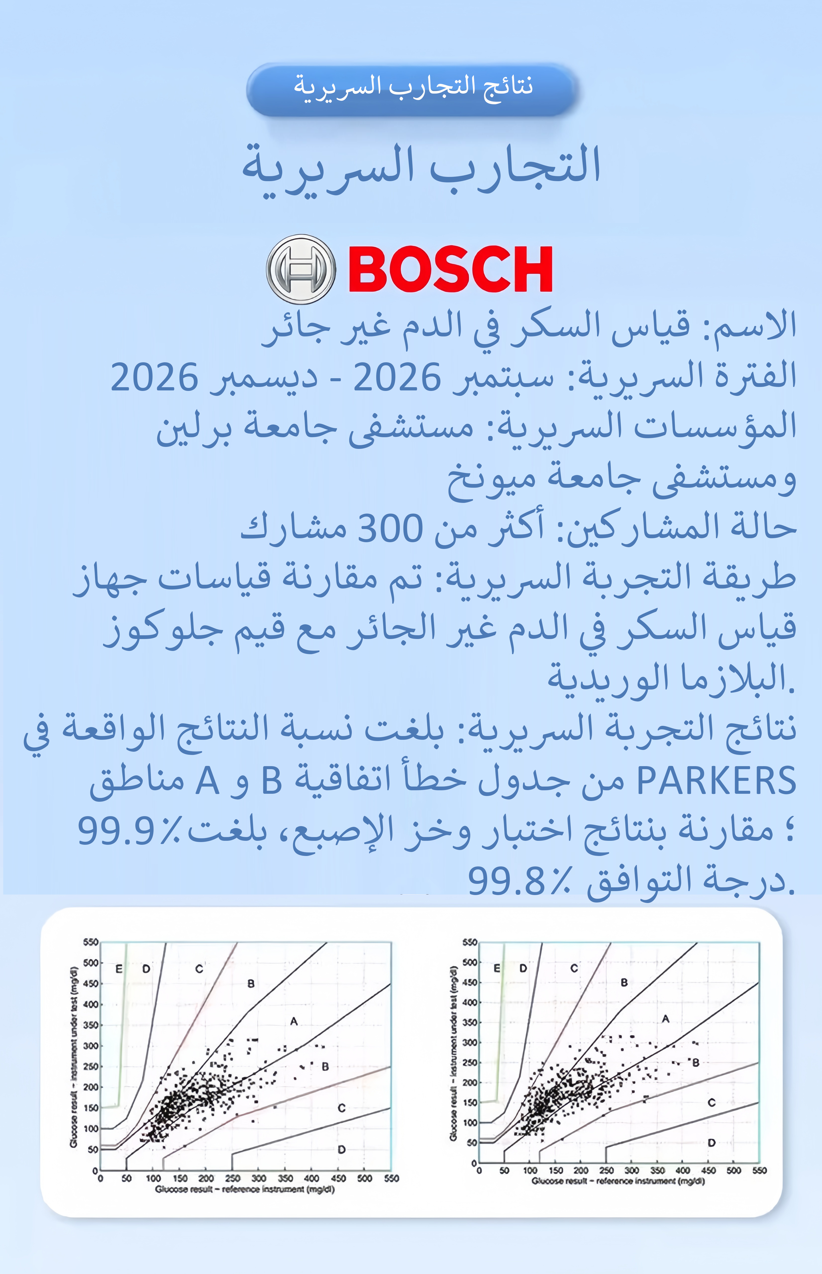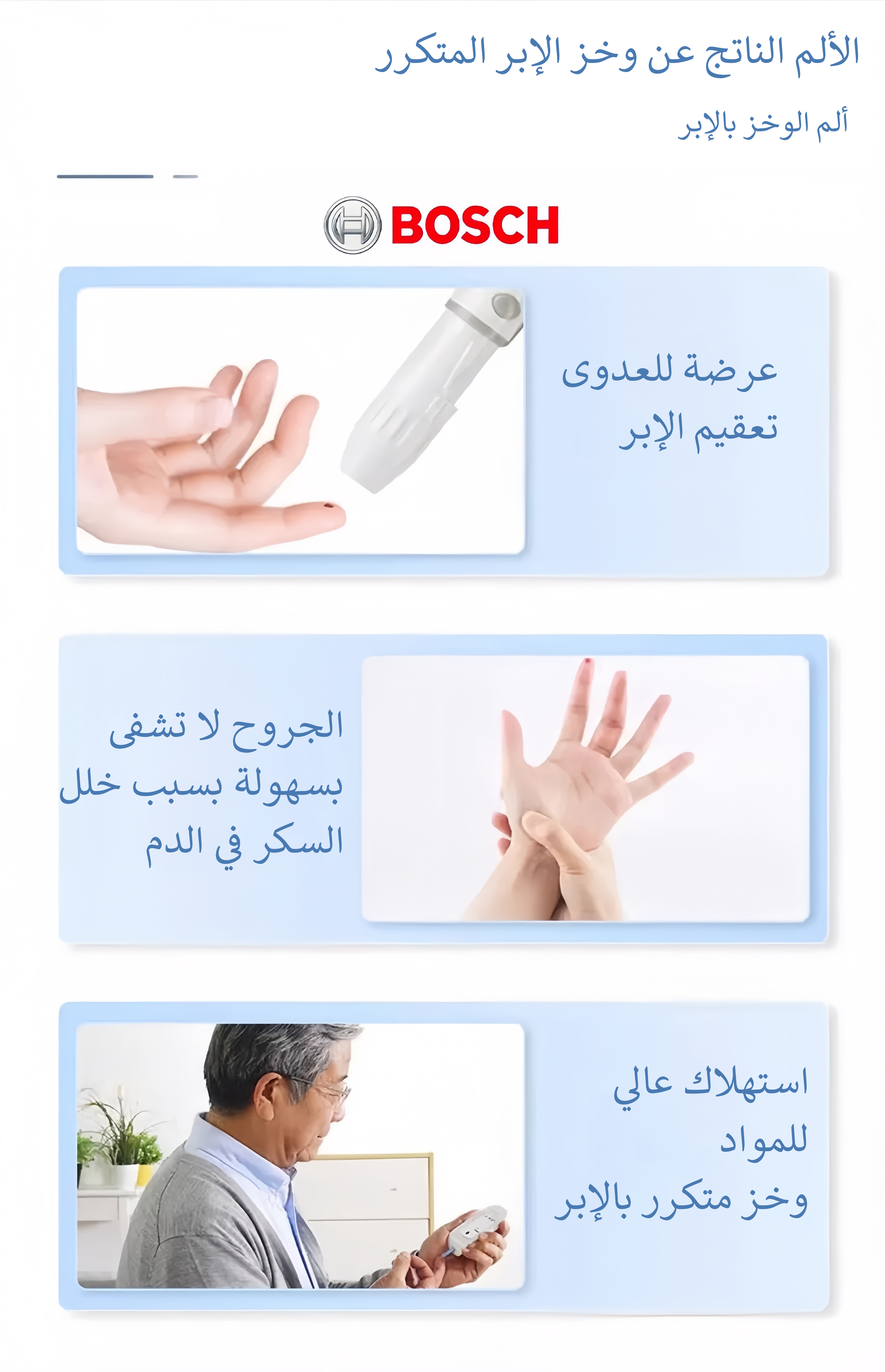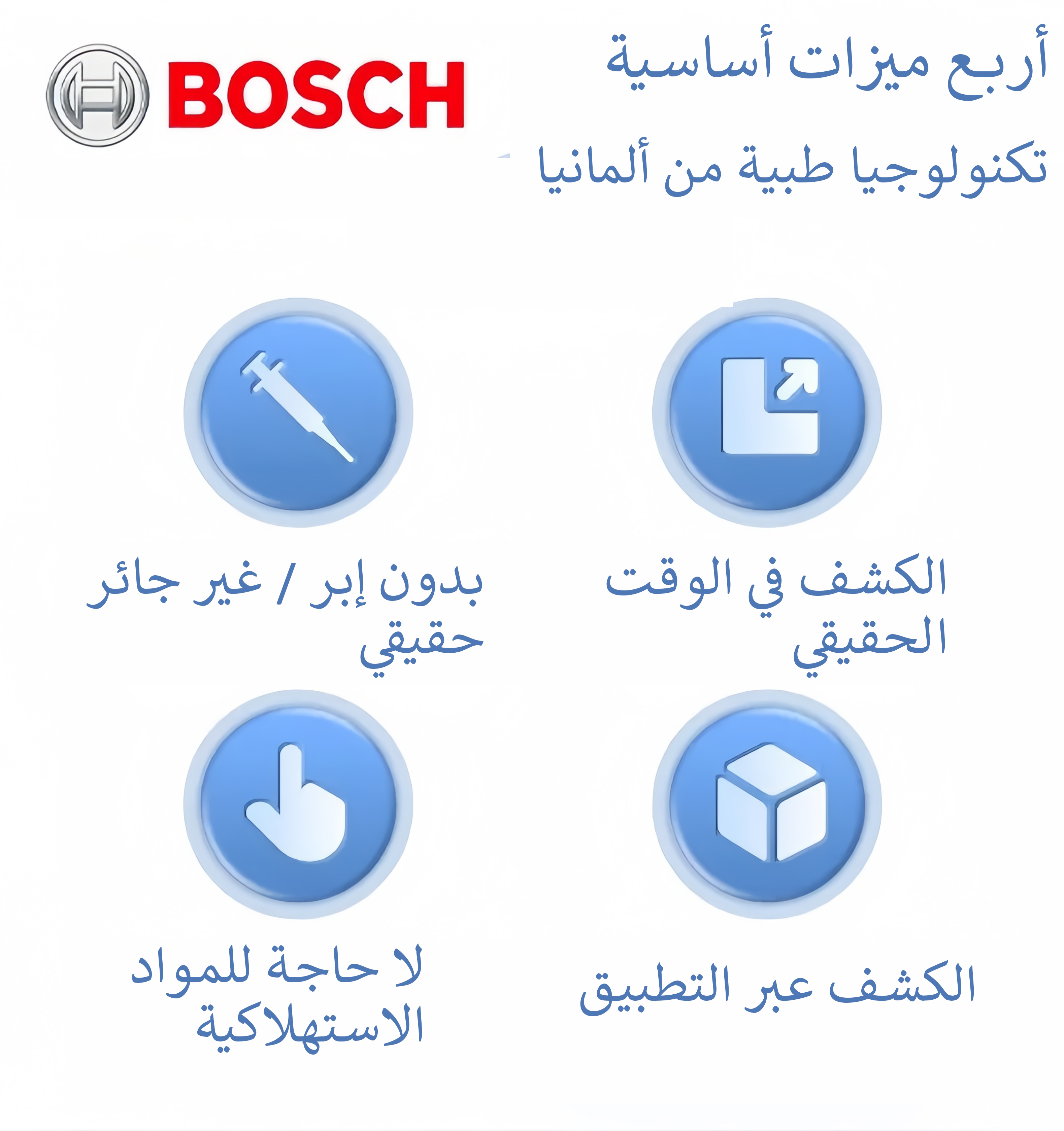 أول جهاز قياس سكر دم متعدد الوظائف وغير جائر من BOSCH ليس مناسبًا فقط لقياس السكر في الدم، ضغط الدم، حمض اليوريك، الجهاز الدوري، الجهاز القلبي والرئوي، الكلى، البروستاتا، معدل ضربات القلب ودرجة حرارة الجسم، بل يحتوي أيضًا على وظيفة علاج أصلية بالليزر.